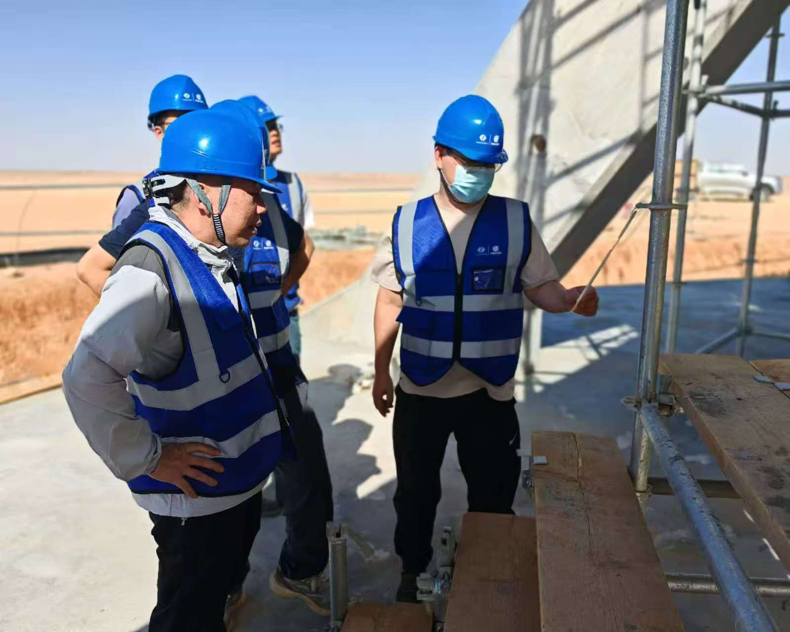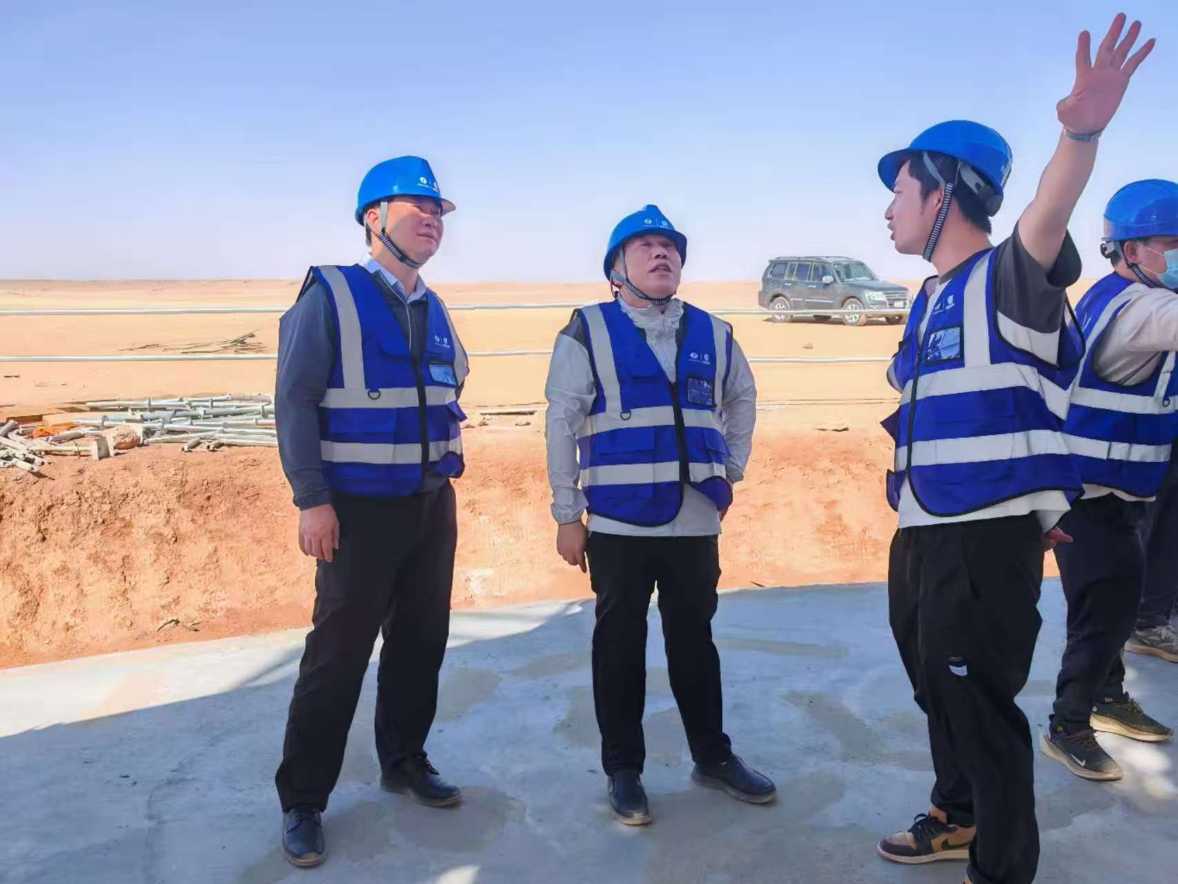 7月19日,,,,,,省物化所所向导刘桂元、pg麻将胡了(官方版)公司董事长宁欣一行到沙特项目一线,,,,,,调理图莱夫项目生产进度、检查项目质量和清静生产等情形,,,,,,并开展“送清凉”慰问,,,,,,向坚守在外洋一线的员工致以真挚问候,,,,,,为项目团队送去防暑药品与殷切眷注。。。。。。。。副总司理王湘源加入。。。。。。。。